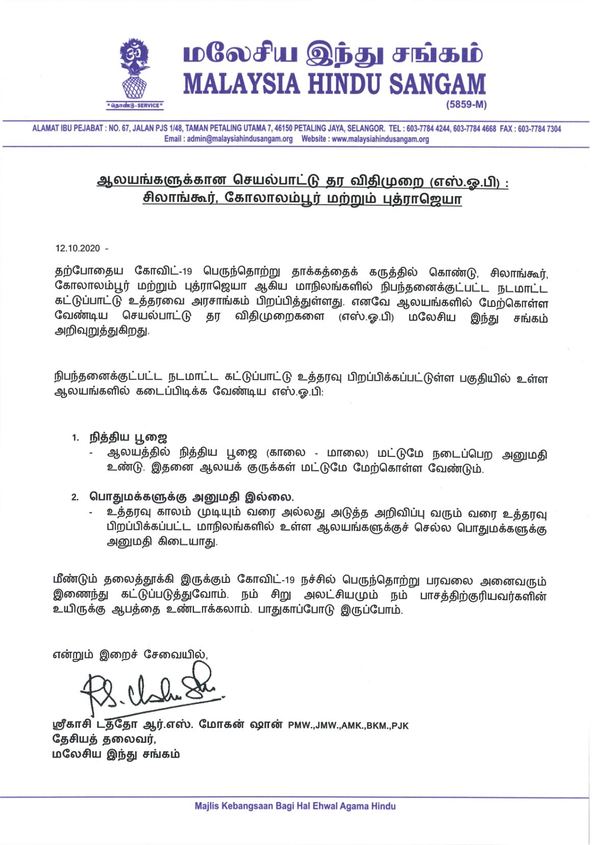 தற்போதைய கோவிட்-19 பெருந்தொற்று தாக்கத்தைக் கருத்தில் கொண்டு, சிலாங்கூர், கோலாலம்பூர் மற்றும் புத்ராஜெயா ஆகிய மாநிலங்களில் நிபந்தனைக்குட்பட்ட நடமாட்ட கட்டுப்பாட்டு உத்தரவை அரசாங்கம் பிறப்பித்துள்ளது. எனவே ஆலயங்களில் மேற்கொள்ள வேண்டிய செயல்பாட்டு தர விதிமுறைகளை (எஸ்.ஓ.பி) மலேசிய இந்து சங்கம் அறிவுறுத்துகிறது.